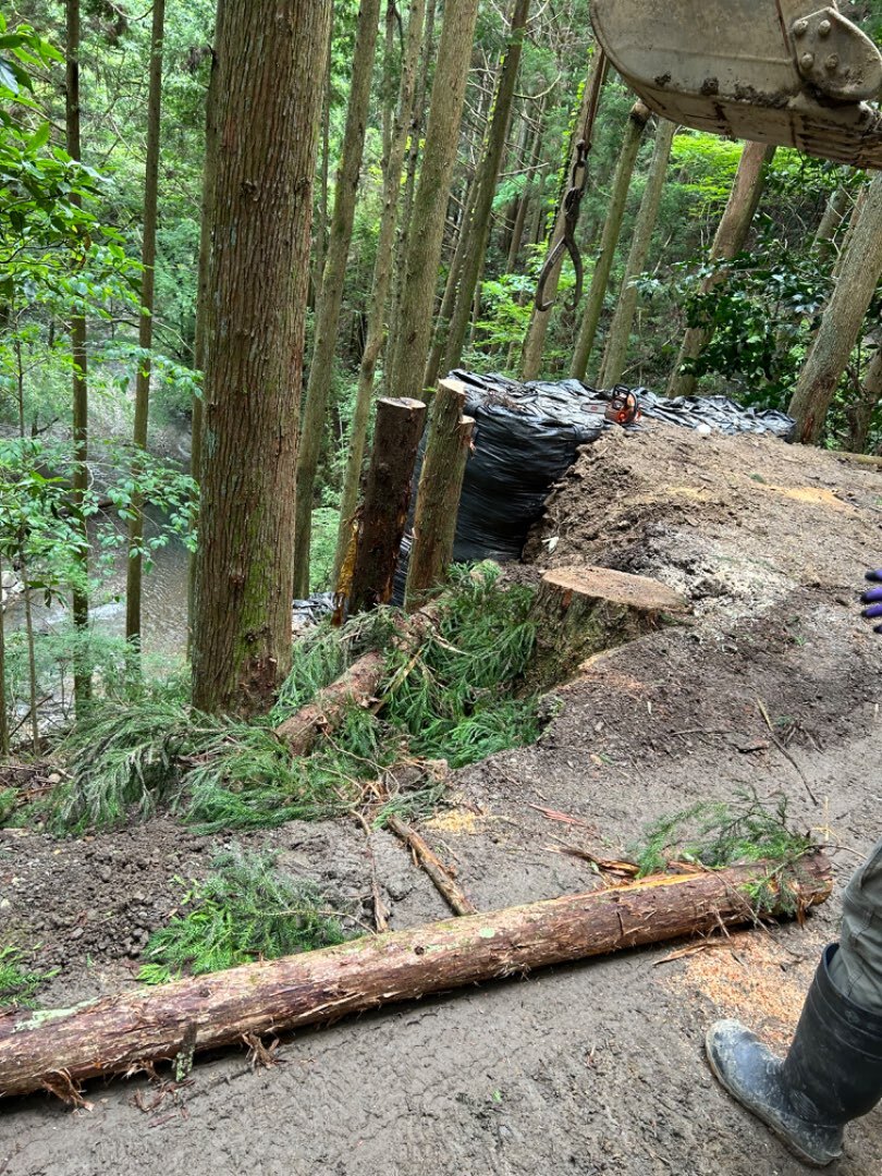 前回の台風で倒れてしまった木を切って土止めを作っています。
